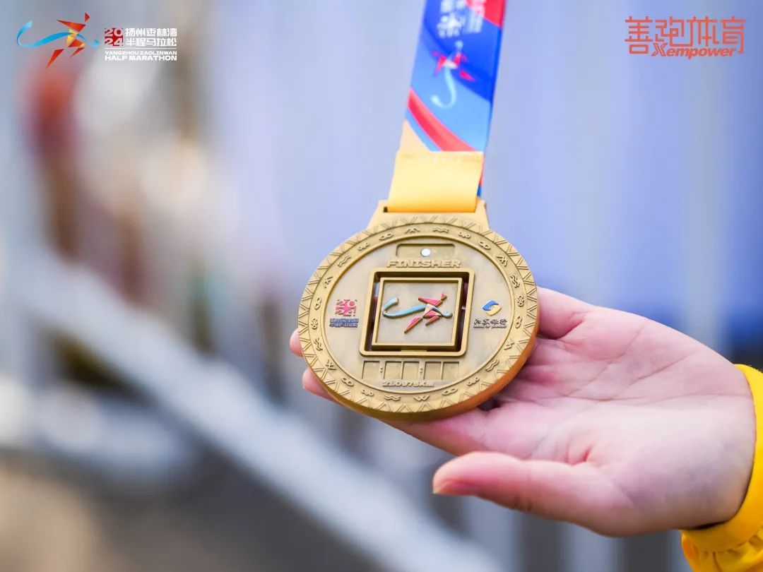 江苏银行2024扬州枣林湾半程马拉松的完赛奖牌设计新颖、寓意深刻,将仪征文化与仪征特色完美融合,每一枚奖牌不仅作为文化IP,展现了仪征的魅力,更承载着对跑者们坚持、拼搏与自我超越的最高赞誉。在奖牌正面的设计中,以铜钱、铜镜的概念构筑起整体造型的灵魂⸺“天圆地方”,辅以古代铜镜的传统纹路,整体风格古典端庄,以及定制的专属字体“汉韵新篆体”来点题,以此彰显汉韵风华。底部仪征的天宁塔浮雕作为奖牌的重心,既表达了悠久历史文化,亦是一种典雅的表达手法。领口使用了仪征的古建筑——鼓楼,作为衔接口,温文尔雅,既藏既现。奖牌的背面设计则是沿用部分铜镜花纹的概念,用较为现代的手法勾勒一圈寓意为“山水花茶”概念的花纹。奖牌上特设铭牌,跑友可镌刻姓名,成就专属荣耀。