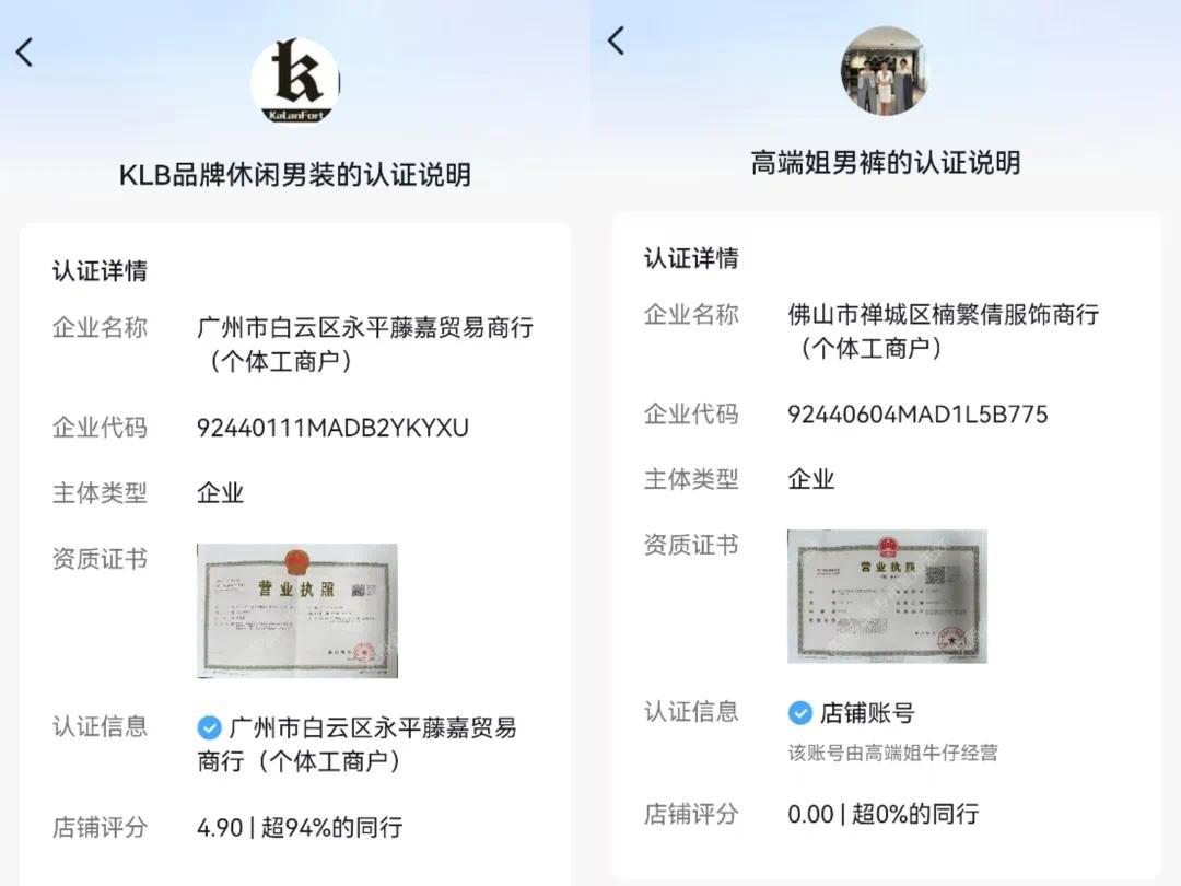 “高端姐”背后公司只是个新冒头的小公司。这个卖“总裁西裤”的“KLB品牌休闲男装”,认证信息是“广州市白云区永平藤嘉贸易商行”,2024年才刚刚注册的小个体户。