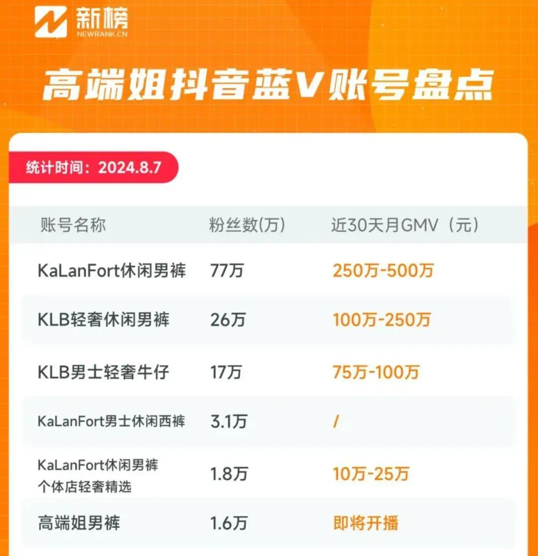 据新榜的数据统计,今年8月,高端姐的6个男裤品牌抖音蓝V账号累计吸粉超126万,30天累计预估带货435万-875万元。同时,高端姐也把KLB男装从不知名小品牌,捧成西装赛道的头号选手。