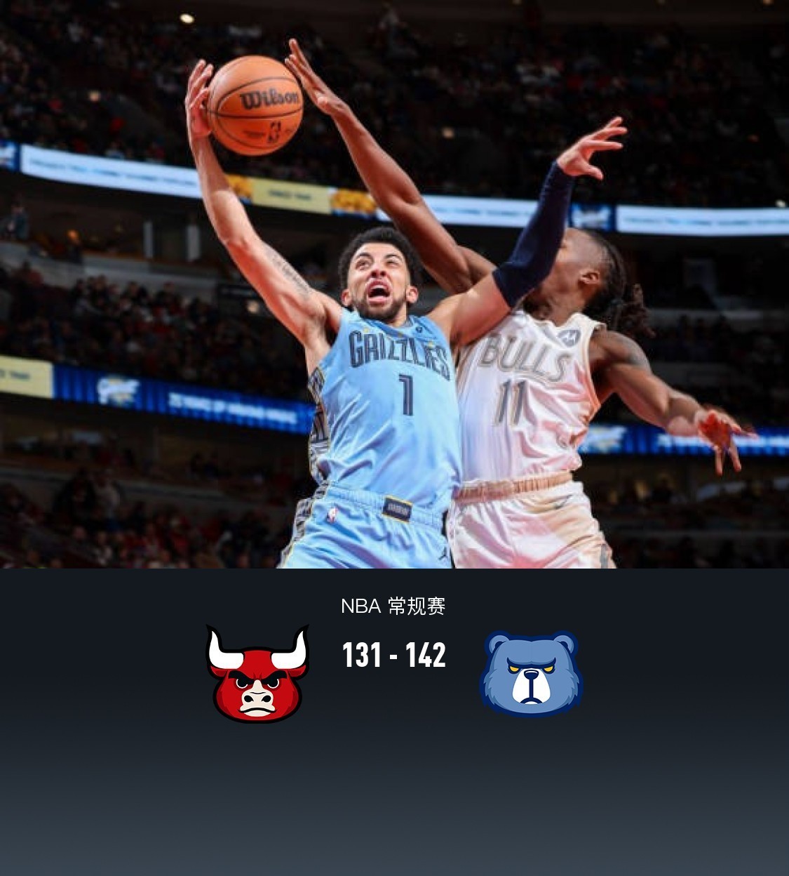 北京时间11月24日NBA常规赛,半场公牛60-64灰熊,最终公牛131-142灰熊。