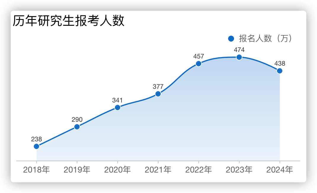 据统计,自2015年起,考研报名人数持续快速增长,2023年考研报名人数高达474万人。不过,2023年的考研报录比仅24.23%,即在当年的考研一族中,有超过300万人落榜。2024年,全国考研报名人数首次出现下降,较2023年减少了36万。但2024年的研考国家线和各高校的复试线却“不降反涨”。
