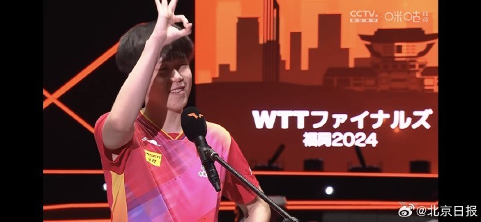 王楚钦:确实, 2024 是一个不平凡的一年。嗯,这一年当中有好有坏,但是庆幸的是自己在最后依旧能比出来这个 3 的这个手势。