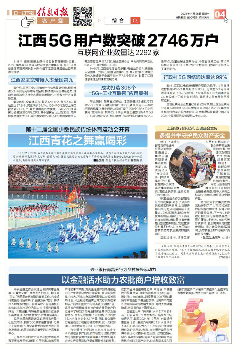 本报讯 信息日报全媒体记者谢梦丽报道:近日,2024(第九届)江西省互联网大会在南昌召开。会上,江西省通信管理局局长彭兴刚介绍了江西信息通信业目前取得的成绩。