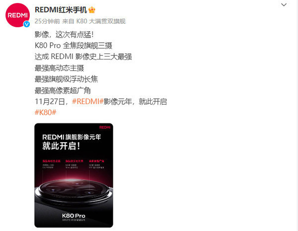 【CNMO科技消息】REDMI K80系列定档11月27日19:00发布。11月25日,REDMI红米手机公布了K80 Pro的影像配置。