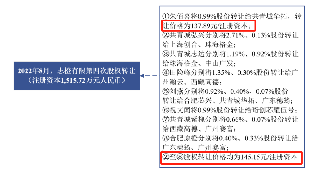 值得关注的是,2022年8月,志橙股份的实控人朱佰喜以137.89元/注册资本的价格将其持有志橙股份0.99%的股权转让给了共青城华拓,成功套现超2000万元。