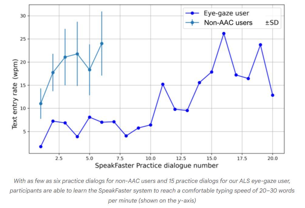 虽然各项实验表明 SpeakFaster 帮助严重运动障碍患者实习高效交流方面具有独特优势,但目前该研究还存在有模型语言单一、短语长度受限、服务成本高昂以及研究样本量较少等局限。