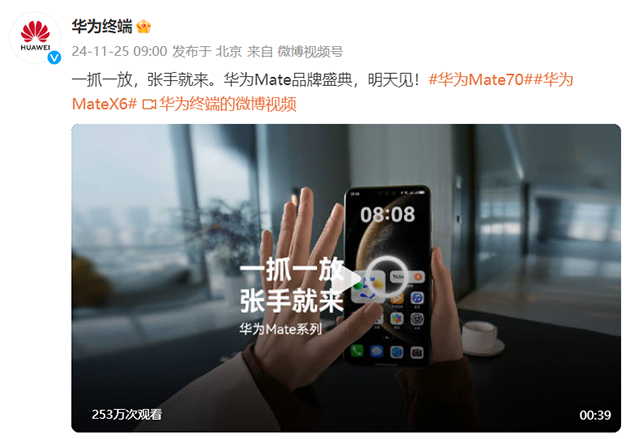iMobile爱科技11月25日讯——还有一天华为Mate品牌盛典正式开启,就在今天上午,华为终端和余承东再预热,视频中余承东使用华为Mate X6演示AI隔空传送功能,只见一只手在屏幕面“一抓",文件就传送到另一台设备中,如此魔幻的操作就在眼前。