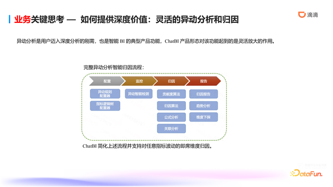ChatBI 产品要能够提供灵活的异动分析和归因能力。异动分析是用户迈入深度分析的刚需,也是智能BI 的典型产品功能,ChatBI 产品形态对该功能起到灵活放大的作用。