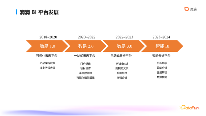 滴滴 BI 平台的发展和业内相似,从可视化报表平台,到一站式报表平台,再到自助分析平台,最后到今天的智能分析平台。