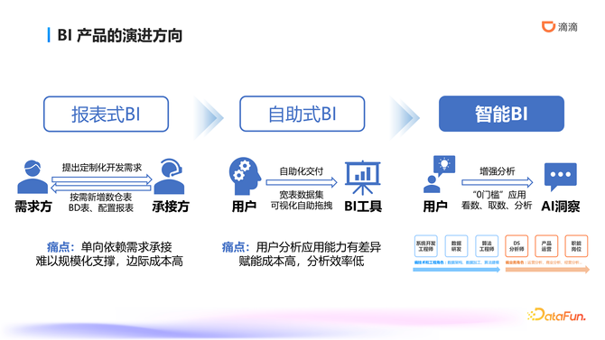 BI 产品的发展经历了从报表式 BI 到自助式 BI 的演变,而当前智能 BI 则吸引了大家的广泛关注与大量投入。无论是早期的增强分析技术,还是如今新兴的 ChatBI 产品形态,其核心目的都在于降低用户利用数据的门槛与成本。我们期望通过融入 AI 的洞察力,使用户能够更加便捷地访问并应用数据资源,从而实现数据普惠。