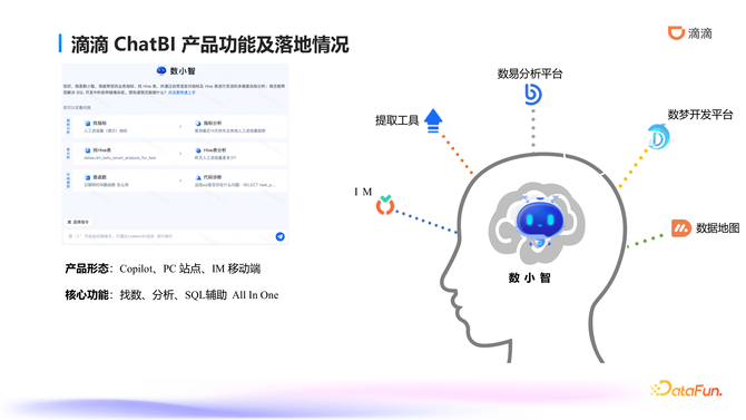 数小智是我们内部 ChatBI 的落地产品,产品形态包含 Copilot、PC 站点、IM 移动端,核心功能包括找数、分析、SQL 辅助 ALL In One,其中绝大部分流量是在 Copilot 这个形态下贡献的。