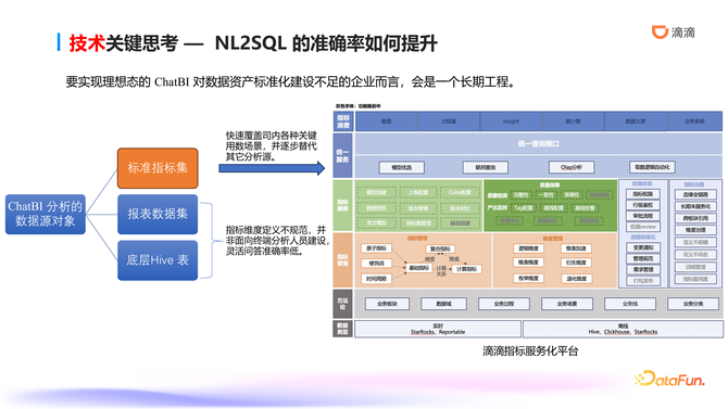 要实现理想态的 ChatBI 对数据资产标准化建设不足的企业而言,会是一个长期工程。报表数据集和底层 Hive 表,指标维度定义不规范,并非面向终端分析人员建设,灵活问答准确率低。需要推动标准指标集,快速覆盖公司内各种关键用数场景,并逐步替代其它分析源。