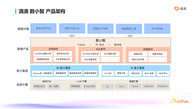 最终,我们的产品架构涵盖了 Copilot、PC 站点、IM 移动端的三种主要产品形态。从分析到 SQL 再到找数,都已实现了全面的落地实施。就今年而言,在公司内部的整体落地情况符合预期。
