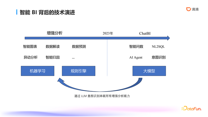 自 23 年起,业内众多公司在传统 BI 基础上进行了大量探索,技术上涵盖了智能问答、意图识别等领域。有趣的是,在 ChatGPT 时代,我们通过 LLM 大模型的意图识别能力,将以往的增强分析功能都串联了起来,用户现在可以通过自然语言进行数据的解读、预测和异动分析。事实上,我们团队在 22 年之前已经开发了许多增强分析的功能,现在开发 ChatBI 时,发现这些功能被完美地整合在了一起,形成了 ChatBI 的坚实基础。