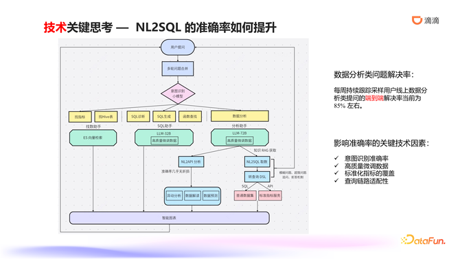 在整个流程中都会有所损耗,综合来看,数据分析类的问题,目前端到端的解决率为 85% 左右,端到端是指从用户提问到最终渲染出图表。