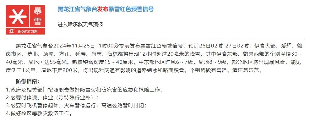 ↑ 黑龙江省气象台也拉响了最高级别的暴雪红色预警。