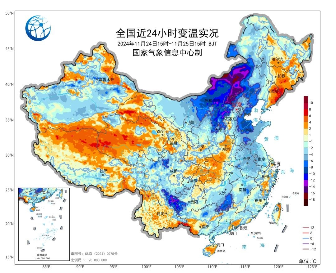 本轮过程最高气温最低点在26日前后,京津冀一带最高气温普遍不足5℃,黄淮、江淮大部也会降到10℃以下。最低气温低点大多在27日至28日晨,最低气温0℃线将南压至江苏安徽北部、河南南部等地,华北北部、东北大部以及西北的不少地方最低气温都会降到-10℃以下。