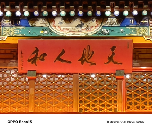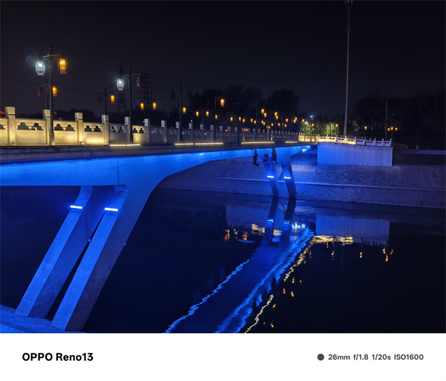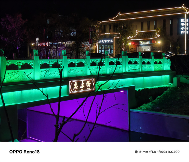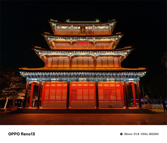 在夜景时,OPPO Reno13表现也十分出色,画面纯净度很高,对于噪点的处理非常到位,得益于1/1.56英寸的大面积传感器,即使在极暗光场景下也有着非常不错的画面亮度,整体的色调依然很有OPPO味,不过度拉高饱和度,而是更加贴近真实,对于光影的处理也延续了自从OPPO Find X6以来的真实立体光影处理,让画面更加具有立体感,不过OPPO Reno13没有搭载长焦镜头,在高倍率的长焦场景下显得有些力不从心,好在AI加持下也能保持一个不错的清晰度。