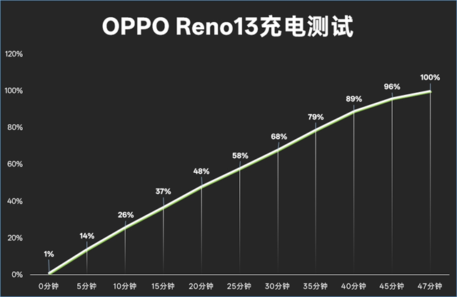 只能流畅游戏还不够,还要能够畅爽,OPPO Reno13在如此轻薄的机身中搭载了5600mAh大电池,能够带来更长的续航表现,畅爽8小时游戏妥妥的,电池大更要充电快,OPPO Reno13支持80W超级闪充,经过我们实测,从1%充至100%只要47分钟,手机快速回血使用更畅快。