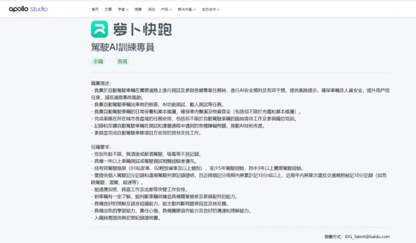 此次招聘的“驾驶AI训练专员”主要负责自动驾驶车辆的数据跟踪与采集、问题记录与反馈以及紧急情况处理等任务。萝卜快跑表示,将优先招聘具备出租车、公交车等工作经验的司机,以更好地推动自动驾驶技术在香港的应用和发展。