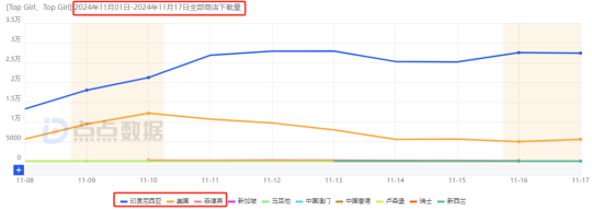 截至目前(11月17日),该作累计下载为32万,其中印尼、美国、菲律宾分别以75.25%、24.15%、0.48%的贡献位列TOP3,就趋势而言,没有明显的增长或下滑,处于维稳状态。