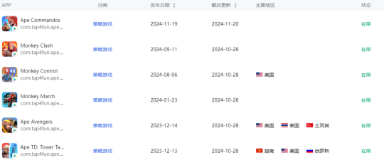 分析Tap4Fun对外测试的新游会发现,虽然其尝试的题材多样化,但对于猿类尤为“痴迷”,目前在测的相关产品(2023年及之后上架)就有《Ape Commandos》、《Monkey Clash》、《Monkey Control》、《Monkey March》、《Ape Avengers》、《Ape TD: Tower Takeover》,当然这应该是受旗下重点产品《Age of Apes》的影响。