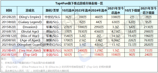 转战游戏后不久,其就接连推出了《King's Empire》、《Galaxy Legend》、《Invasion》等爆款,与此同时也确定了扎根SLG,只做一个品类的“针尖化”战略。但当时间来到2017年,公司却遭遇上市失败、核心团队出走的打击。 自此Tap4Fun沉寂了三年多,直到2020年《Kiss of War》的发力才再次将其拉回出海厂商前列的队伍,之后配合新游《Age of Apes》与《Kingdom Guard》不错的市场成绩,让其有了再战下一个产品周期的底气。 然而,2021下半年开始,Tap4Fun似乎陷入了第二次的产品“断代期”,虽然测试了不少新游,当一直没有黑马产品出现。直到最近,点点出海发现,该公司似乎跑出两款值得关注的新游。 一款是名为《Top Girl: Produce 101》主打女团题材的SLG,在买量极低的情况下,月流水已经突破500万,另一款名为《Sea War: Raid》的海洋军事SLG更是凭借1630万的月流水成为Tap4Fun旗下收入第3高的游戏。此外,虽然Tap4Fun旗下其他经典产品都已经运营多年,但其2024年至今依然创造了高达9.2亿的收入(不包含国内安卓端)。 那么,新出现的两款潜力新游究竟有着怎样的测试经历?其市场表现及游戏内容如何?当下Tap4Fun的重点产品有哪些?表现都是一致下滑的吗?收入贡献最多的产品是哪个? 为了解答上述问题 ,点点出海将结合下图,逐一分析和拆解Tap4Fun的新游及重点新游!