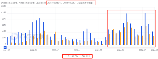 2021年6月中下旬,《Kingdom Guard》上线海外,之后陆续登陆170多个国家及地区,过程中进入34个区域市场iOS游戏畅销榜Top 10,登上105个区域市场畅销榜Top 100,当前其依然位于23个区域市场iOS游戏畅销榜TOP50。
