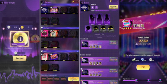 游戏伊始,玩家会招募到3个女孩形成初始女团(更多卡牌会通过抽卡和剧情解锁),之后需要来到工作室进行录制单曲,不同的单曲分属不同的歌曲类型(POP、Rock、Hip-Hop等),有不同的星级和其他详细信息,所以这就需要玩家匹配最合适的女孩配完成录制,单曲的销售将带来现金和粉丝量的增加。