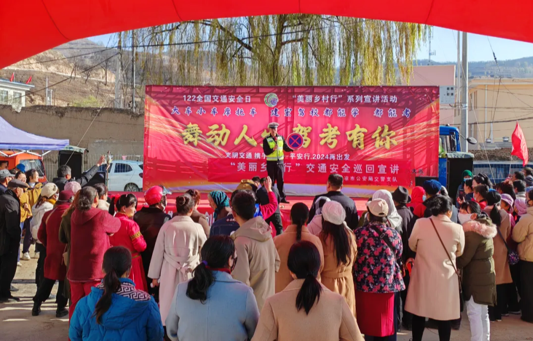 为进一步筑牢农村道路交通安全防线,切实提高农村地区群众的文明意识、法治意识和安全意识,有效预防和减少道路交通事故发生,营造安全、有序、和谐的道路交通环境。近日,平凉市公安局交警支队联合静宁县公安局交警大队、德顺高速公路大队走进静宁县红寺镇红寺村,为群众送上了一场展演式、互动式的“美丽乡村行”巡回宣讲活动。