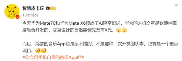 【CNMO科技消息】日前,华为Mate 70系列和Mate X6预热了AI隔空投送新技能。对此,数码博主@智慧皮卡丘 表示,华为的人机交互是软硬件高度融合开发的,交互设计的自然度领先友商几代。