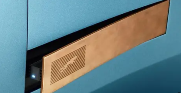 最新预告图聚焦于车身某处的特色长方形饰板,其上镶嵌着捷豹新品牌标识,并具备弹出功能,内部隐藏着一个黑色长方体部件,尽管饰板开启幅度有限,推测非隐藏式门把手设计。
