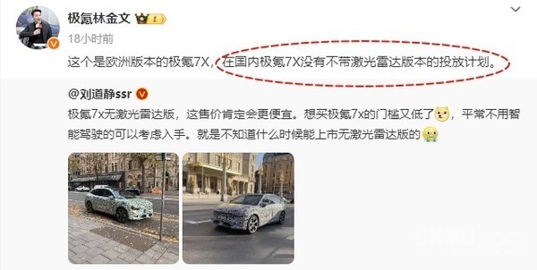 近日,有汽车博主放出疑似极氪7X无激光雷达版的实车图,并猜测售价肯定会更便宜。其表示,购买极氪7X的门槛又低了,平常不用智能驾驶的可以考虑入手,但是不知道什么时候能上市无激光雷达版。林金文转发微博回应称,图片中的车型是欧洲版本的极氪7X。他表示,在国内市场,极氪7X没有不带激光雷达版本的投放计划。