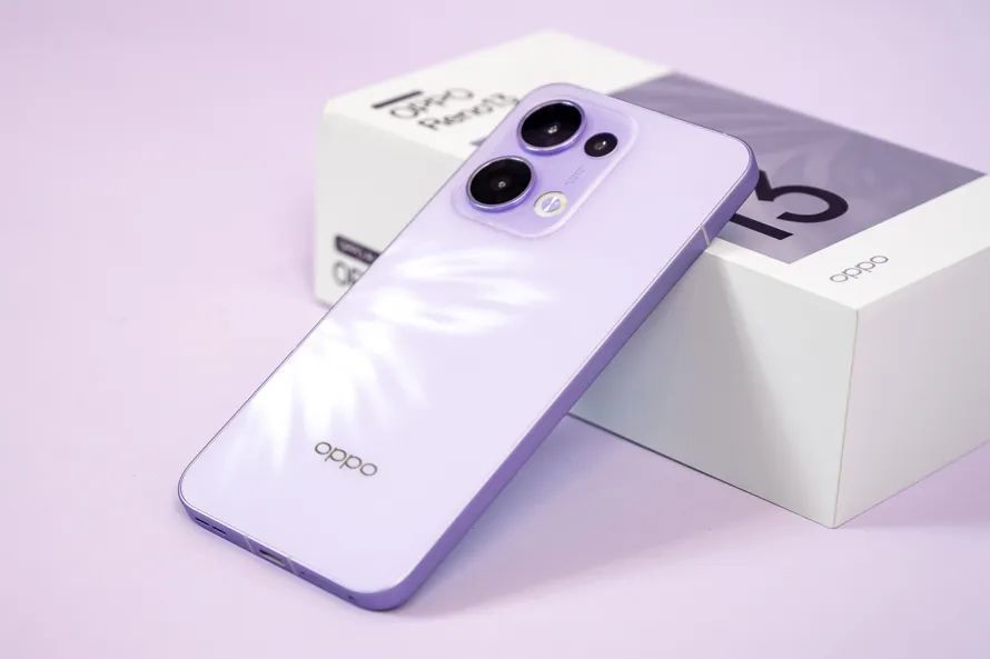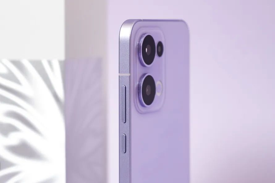 Reno13采用了直角铝合金金属中框,抗弯折能力提升,而且与后盖一样都是紫色。