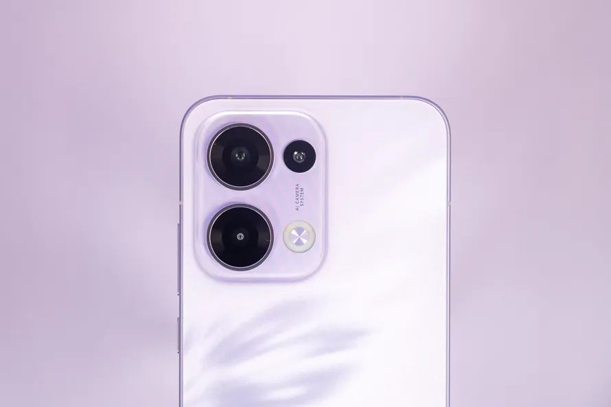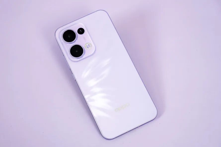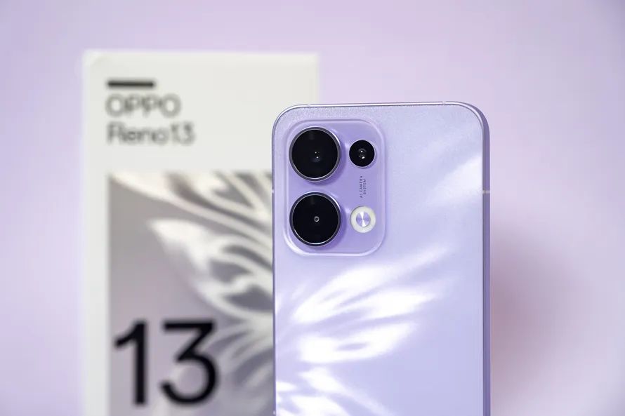 OPPO Reno13拥有蝶蝶紫、星河蓝以及午夜黑三种配色。我们这款是主打色蝶蝶紫,机身紫色的饱和度没有很高,后盖摸起来有磨砂质感,不会沾染指纹。当然,如果只是这样,那也太平平无奇了。