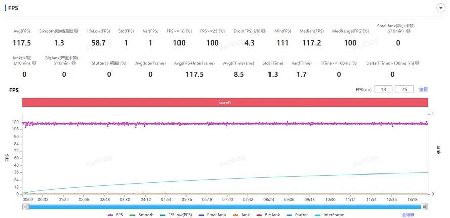 那么在游戏中,Reno13的性能表现如何呢?我们选择《王者荣耀》开启极高帧率,超高分辨率以及极致画面总质量,同时打开游戏稳帧功能,进行测试。一局游戏下来,Reno13的平均帧率达到了117.5fps,没有出现任何卡顿,平均功耗则为3.88W。