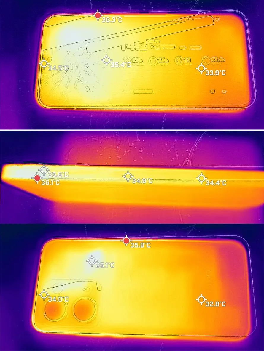 在游戏半个小时之后,我们测试手机的温度,可以看到手机正反面最高温度都在35℃左右,而温度最高的地方出现在金属边框上,达到了36.3℃。