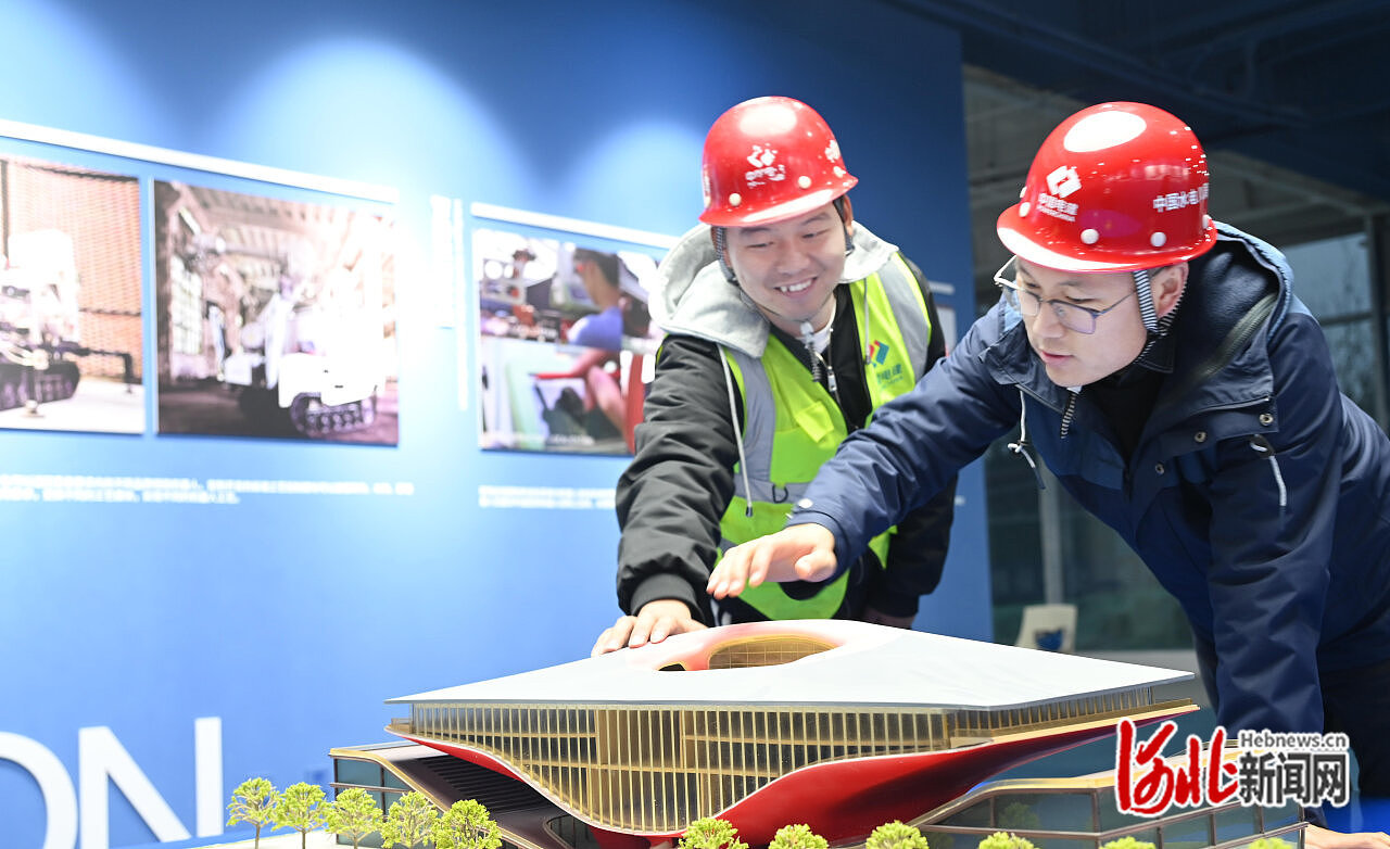 11月13日,“雄安之翼”智汇实验室内,项目建设者(左)在项目建筑模型前向参观者介绍“雄安之翼”是如何被打印出来的。