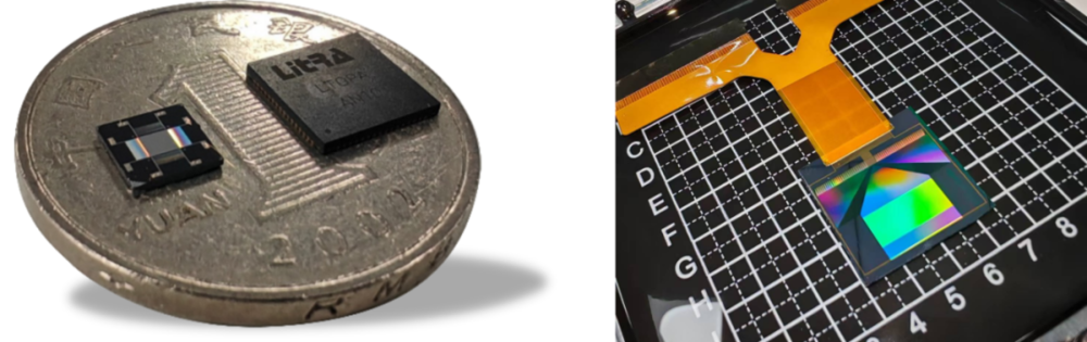 (左)小尺寸OPA芯片与驱动ASIC(右)大口径OPA芯片,图片来源:力策科技