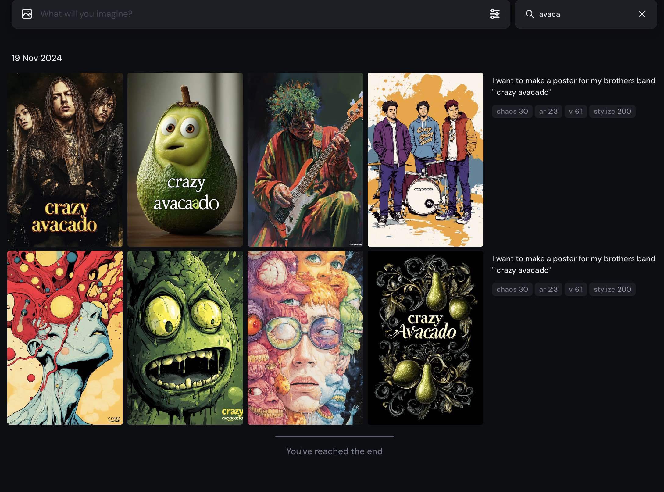 我用同一个最基础、完全不复杂的Prompt,让Dream Machine和Midjourney对比一下:i want to make a poster for my brother band “crazy avocado”.(我想为我兄弟的乐队“疯狂牛油果”做一张海报。)