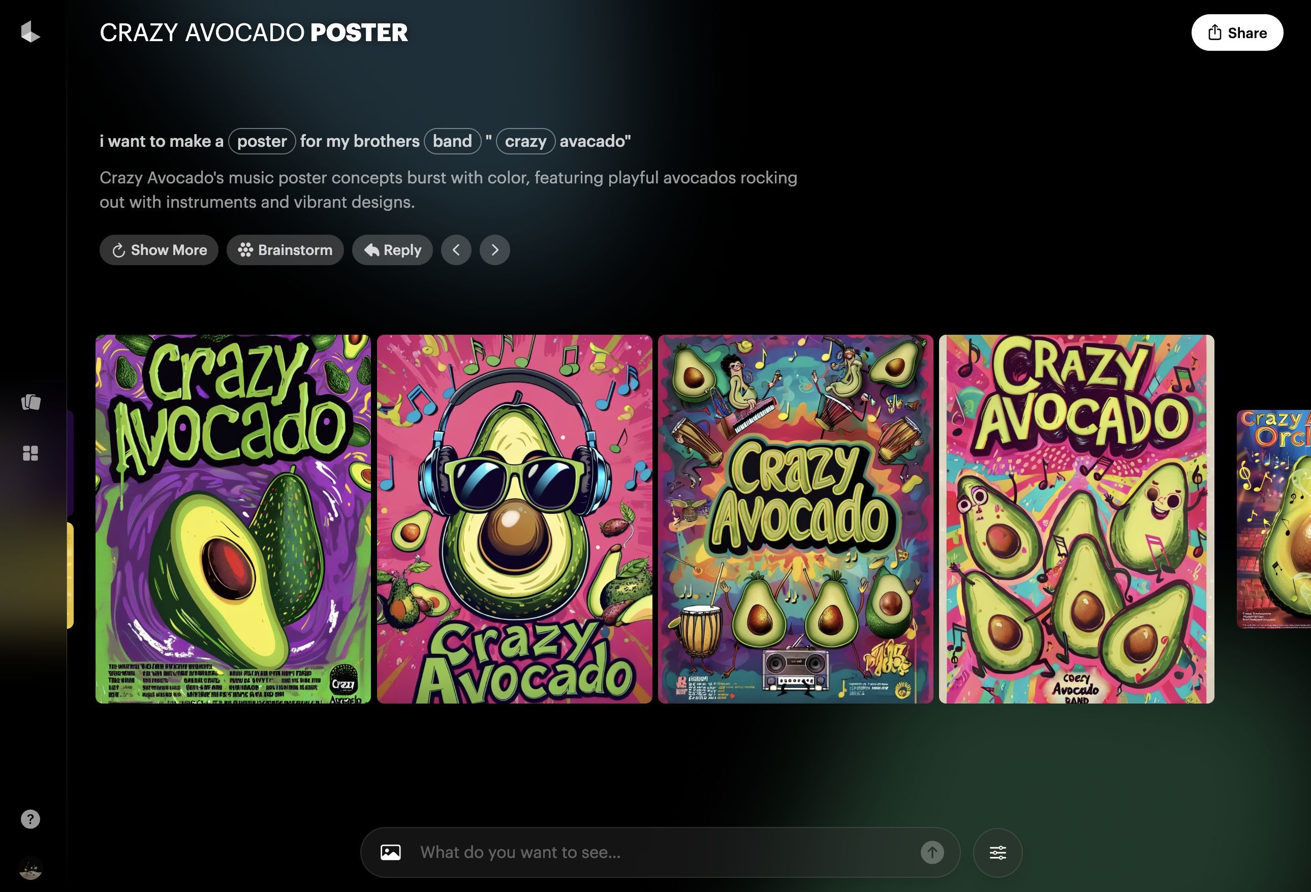 △Dream Machine根据“i want to make a poster for my brother band ‘crazy avocado’”生成的乐队海报。