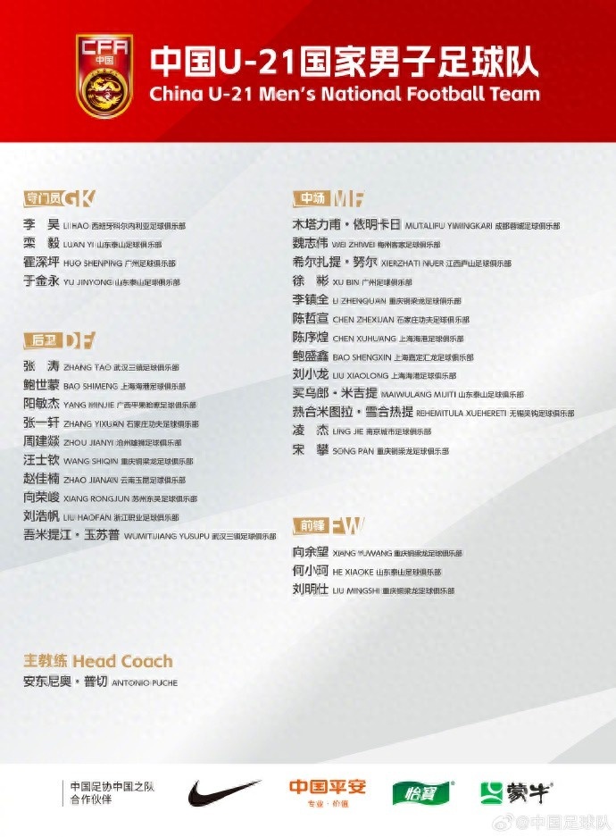 11月27日,据中国足协网站消息:为备战2025年U-23亚洲杯预选赛及2026年名古屋亚运会,经队伍教练组研究、中国足球协会批准,中国U-21国家男子足球队定于2024年12月1日至15日赴海南省海口市组织集训并参加热身赛。30名运动员入选本次集训,何小珂、木塔力甫、向余望在列。