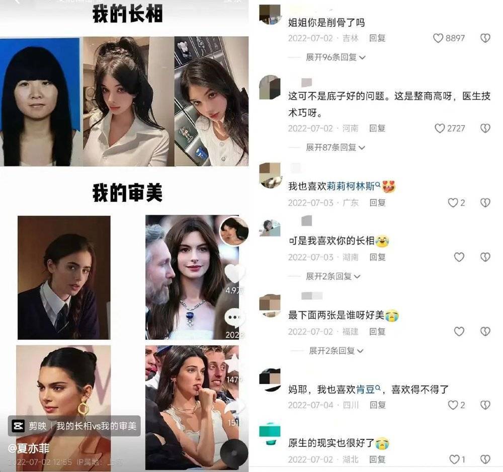 因为整得酷似安妮·海瑟薇,“夏亦菲”在抖音吸粉超10万。她的主要内容是分享自己的整容经历,对比自己整容前后的样子。坊间传言,为了整成现在这个样子,“夏亦菲”花了一辆保时捷的钱。