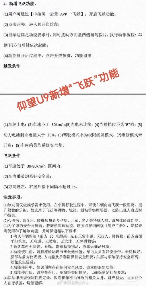 满足要求后,驾驶员同时拨动方向盘两侧指驾拨片,随后车辆将执行动作流程:车辆下压-前后轴依次起跳,飞跃条件包括车速处于30km-80km/h区间,方向盘左、右拨片按下间隔不超过1s。