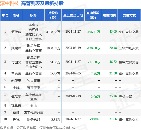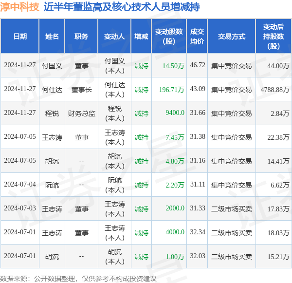 淳中科技近半年内的董监高及核心技术人员增减持详情如下: