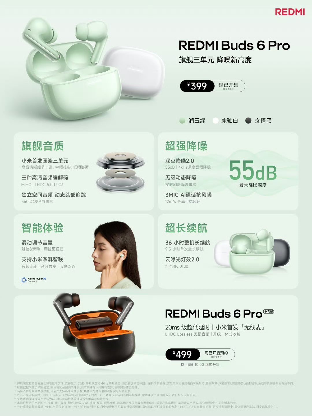 REDMI Buds 6 Pro 提供冰釉白、玄悟黑、润玉绿三种配色,售价 399 元,现已开售。REDMI Buds 6 Pro 电竞版提供一款配色,售价 499 元,将于发布会后开启全款预售,12月3日 上午 10:00 正式开售。