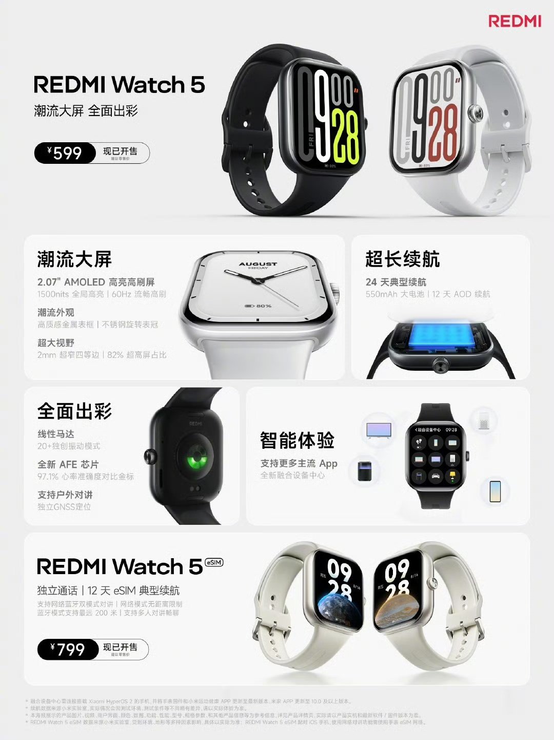 REDMI Watch 5 提供典雅黑、皎月银两种颜色可选,售价 599 元;REDMI Watch 5 eSIM 提供浮光钛配色,售价 799 元,现已全部开售。