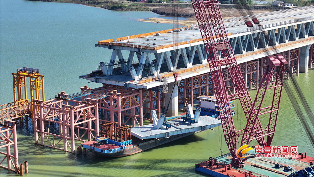 南昌新闻网讯 11月27日,晴空万里,在隆兴大桥跨赣江中支主桥建设现场,第80节主桥钢桁梁吊装施工正紧锣密鼓进行。目前,隆兴大桥跨赣江中支桩基完成100%,承台完成100%,墩身完成100%,盖梁已完成100%,上层公路连续梁累计完成15个节段,公路连续梁、钢管支架、上层公路梁底板钢筋、盘扣支架正在施工中;主桥钢桁梁累计施工完成79节,完成比例84%,正冲刺下月中旬合龙目标。(张娟 洪观新闻记者 马悦 摄)