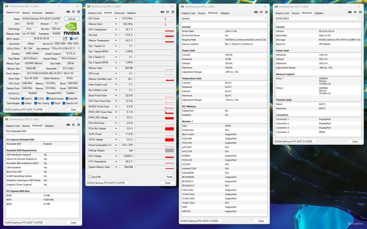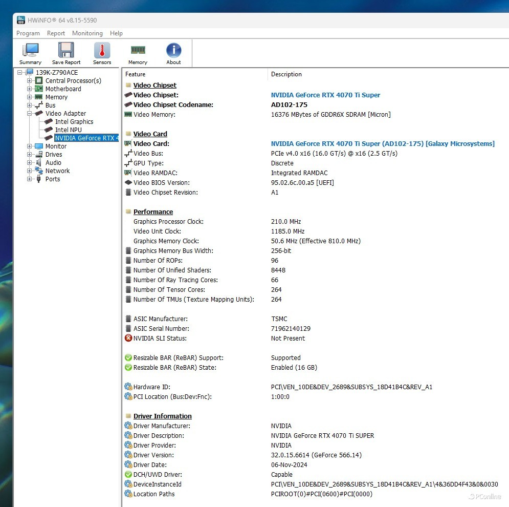 从GPU-Z软件中我们可以更详细看到本次参测对象影驰RTX 4070 Ti SUPER 金属大师Plus OC显卡更详细的信息:AD102-A1核心、BIOS版本号95.02.6C.00.A5、CUDA核心数量为8448个、显存容量16GB、GPU核心基础频率为2340MHz、Boost频率为2655MHz、显存频率等效21Gbps。