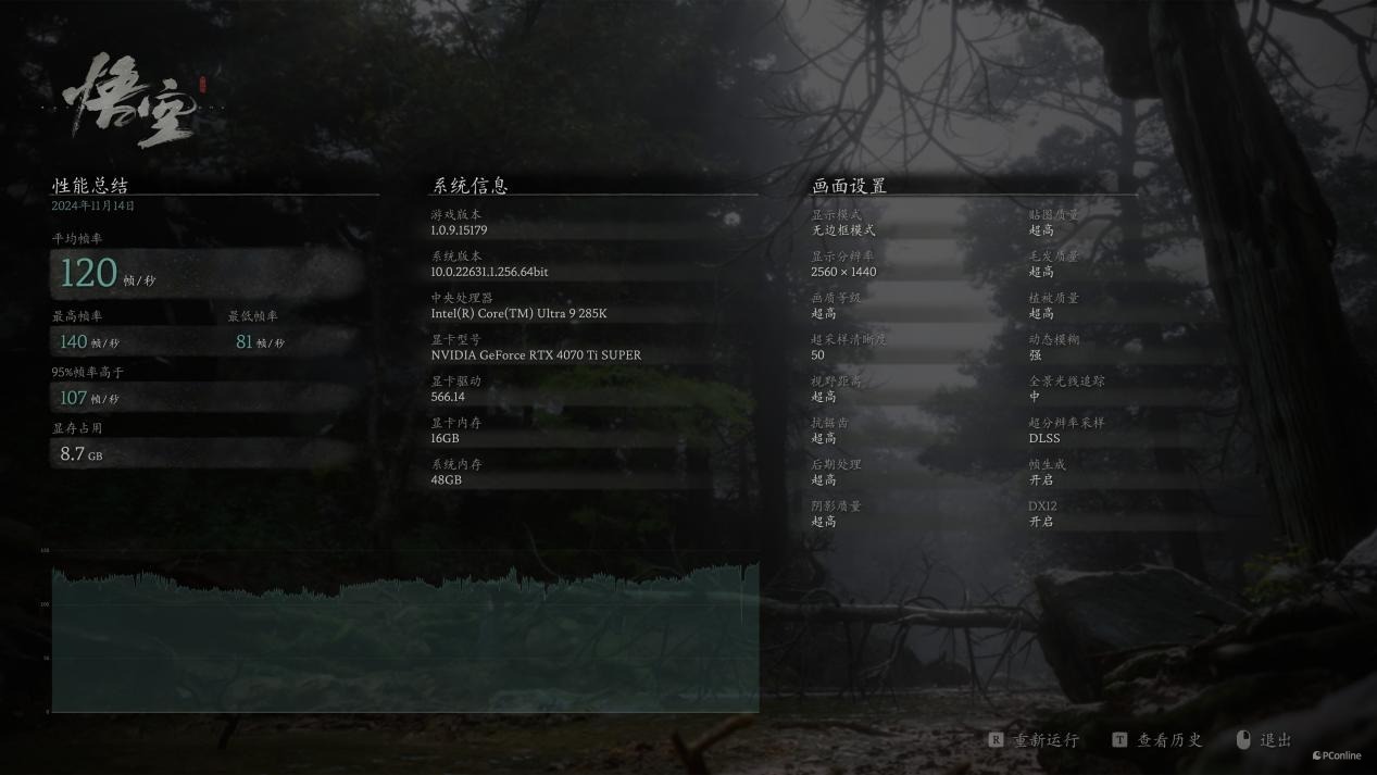 游戏方面,影驰RTX 4070 Ti SUPER 金属大师Plus OC显卡虽然定位2K高刷的游戏显卡,但实际上在主流的4K分辨率游戏流畅度也是相当可以。即使是黑悟空这样的显卡杀手游戏中,也能达到120 FPS的水平。